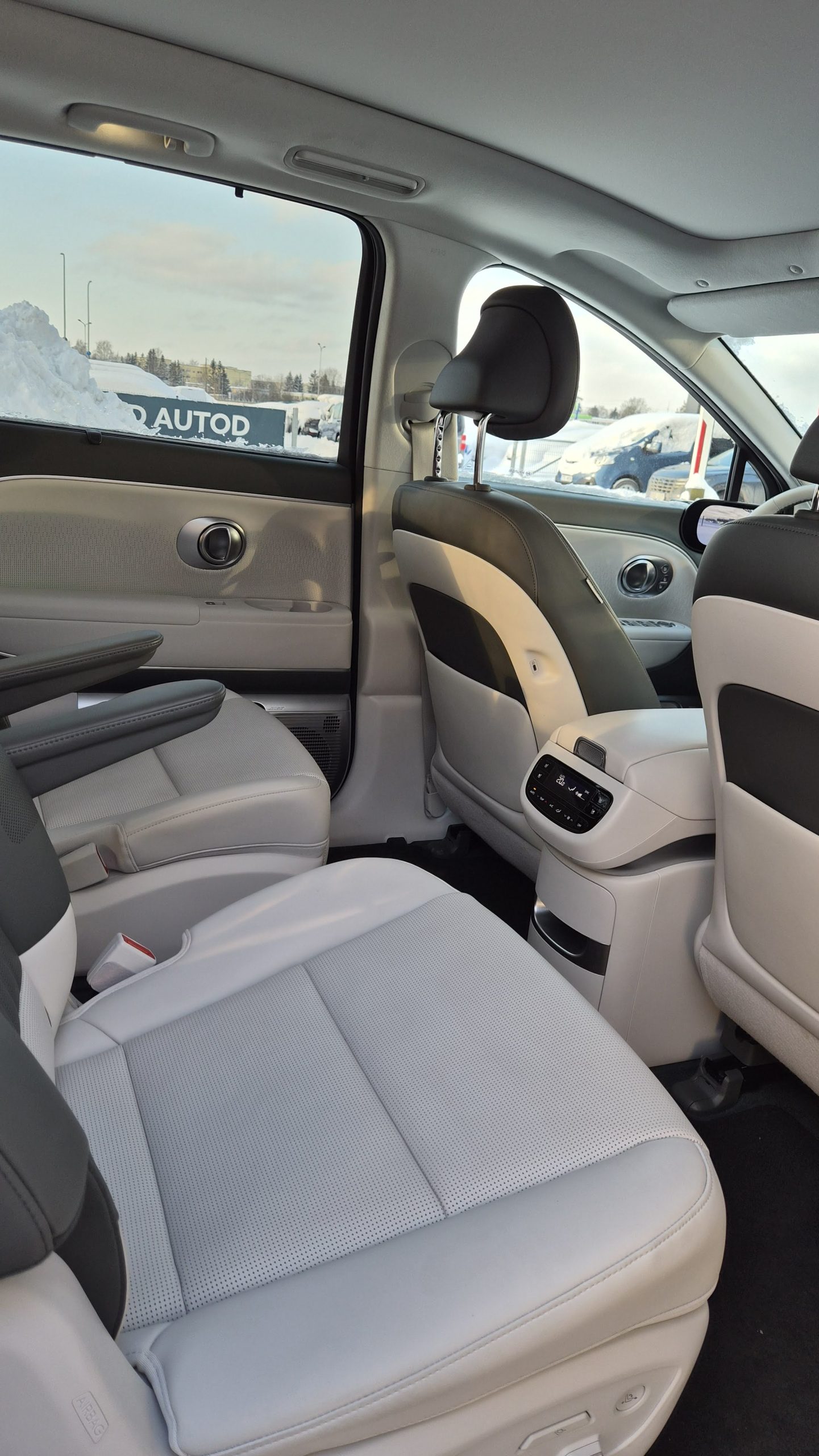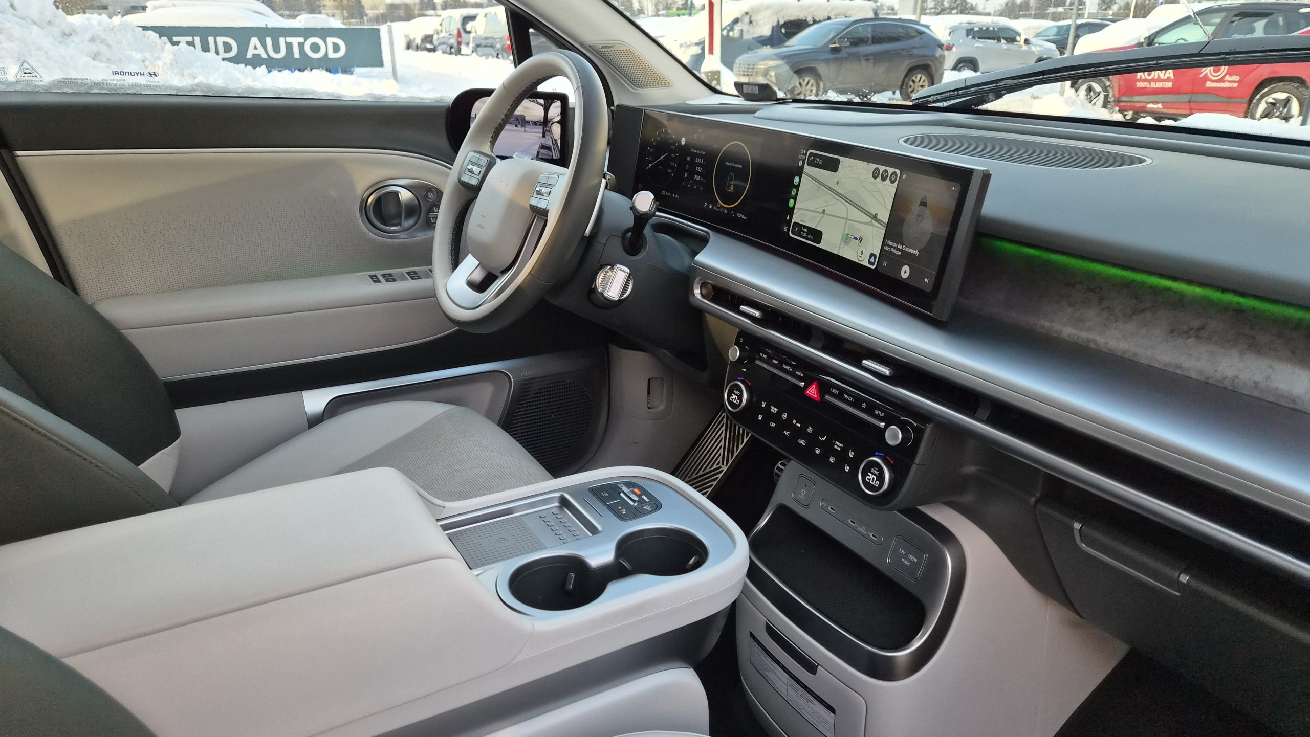 Põrand on täiesti tasane, mis loob pretsedenditu avaruse tunde. Hyundai insenerid on loonud rahustava keskkonna, materjalivalik on segu jätkusuutlikkusest ja luksusest – taaskasutatud plastist ja kangast pinnad on käe all soojad ja kutsuvad, mitte steriilsed. Isegi hele kunstnahk istmetel ei mõju külmana.